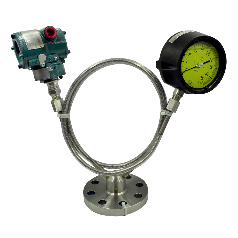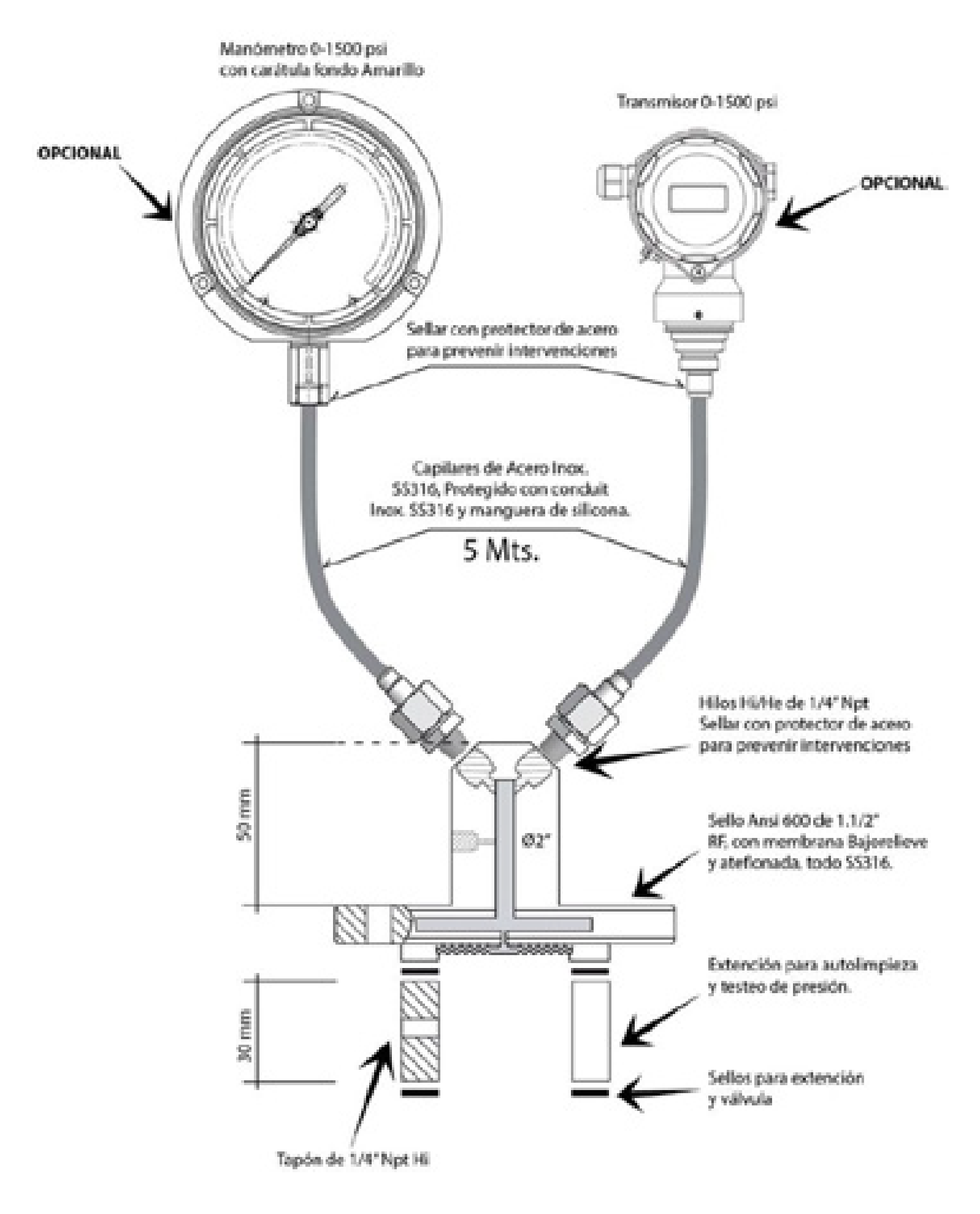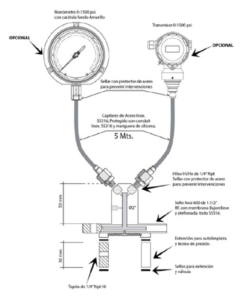 Diseño de Sello de Diafragma Salida Doble, para manómetro y transmisor de presión. Los largos de los capilares son configurables en la medida de la necesidad del usuario y se acepta que el cliente pueda proporcionar los equipos de medición.